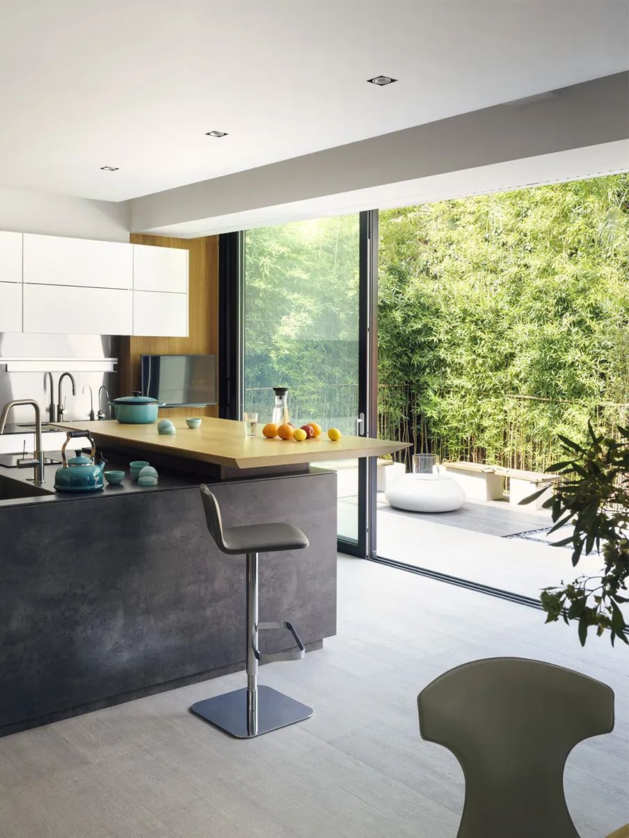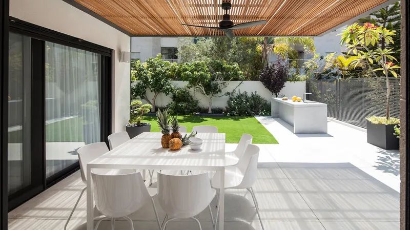 閑暇時(shí)和家人在庭院里聚聚餐、聊聊天,也無需顧及外界的影響,頗有世外桃源的意味。加上周圍濃郁的綠植,頂部空間設(shè)計(jì)陽光頂,隱私感也會(huì)更強(qiáng)。
