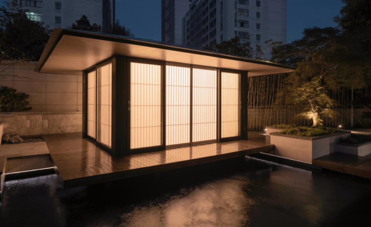 • 禪意茶亭:用格柵營造光影效果,搭配流水缽與苔蘚微景觀;
