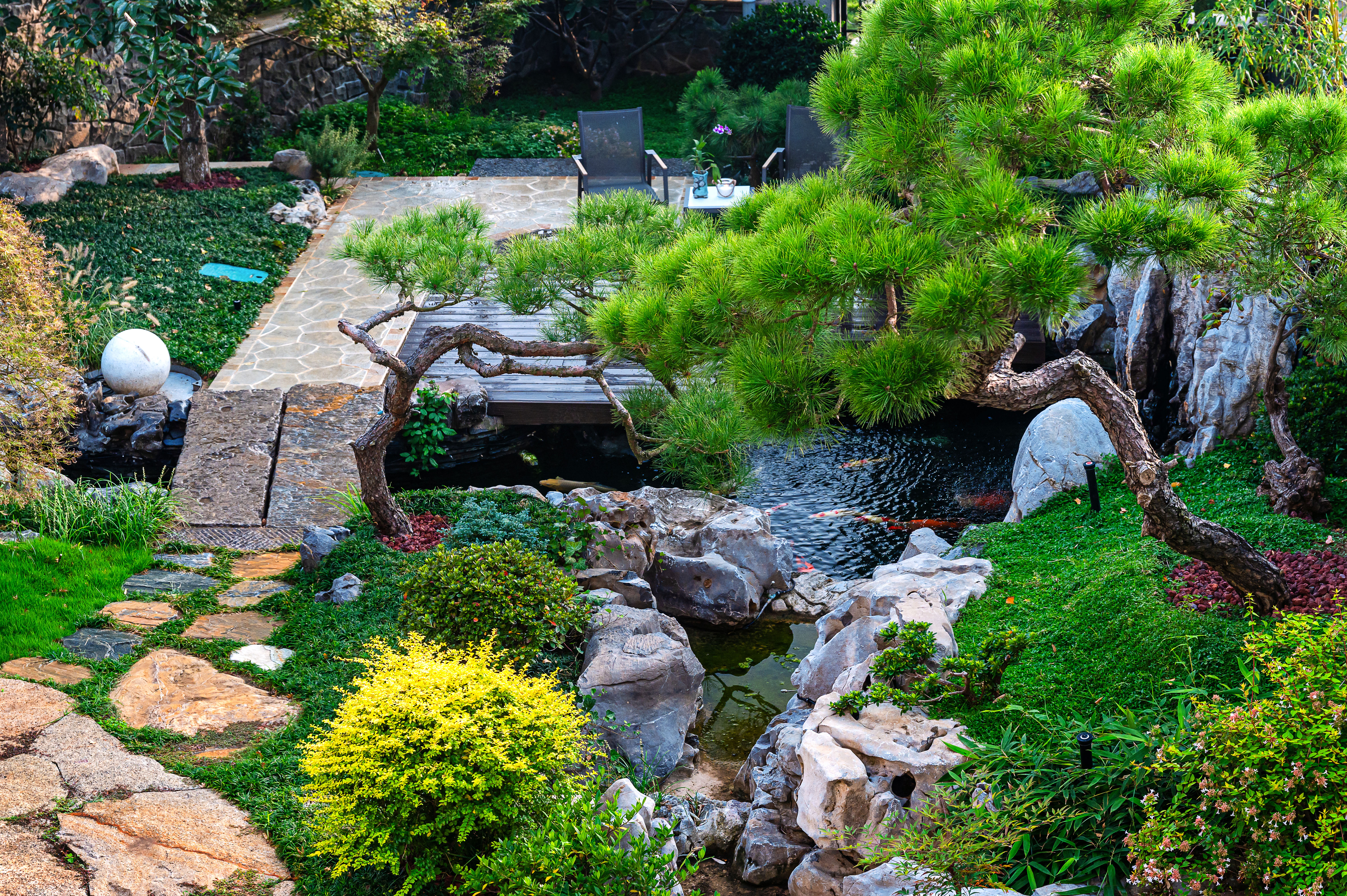 通過對現有魚池山石進行修復,利用“新”凈化循環技術把水做活做凈,讓池中水清澈透明,可見游魚。觀魚,觀的是游魚戲水的靈動姿態。置石引泉,迎松入境,居有流泉,便有了靈氣,觀池中錦鯉,樹影浮動,亦動亦靜的風景里,三兩知己,生一爐炭,煮一碗茶,總歸是愜意,愿隨草木飲清茶,且與山水共清歡。
