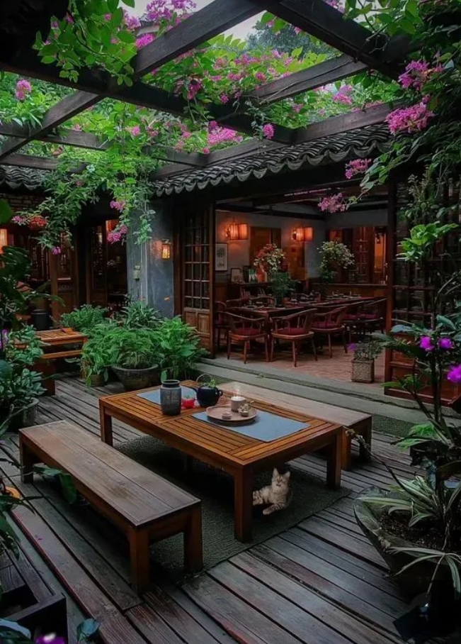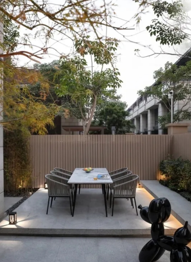通過裝飾元素、色彩搭配和家具布局營造溫馨的用餐氛圍,戶外餐廳的設計應與庭院的整體風格和周圍環境相融合,創造出和諧的戶外空間。