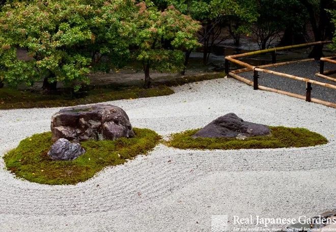 日式枯山水的庭院中,常常使用白砂、碎石來模擬水流,營造禪意空間