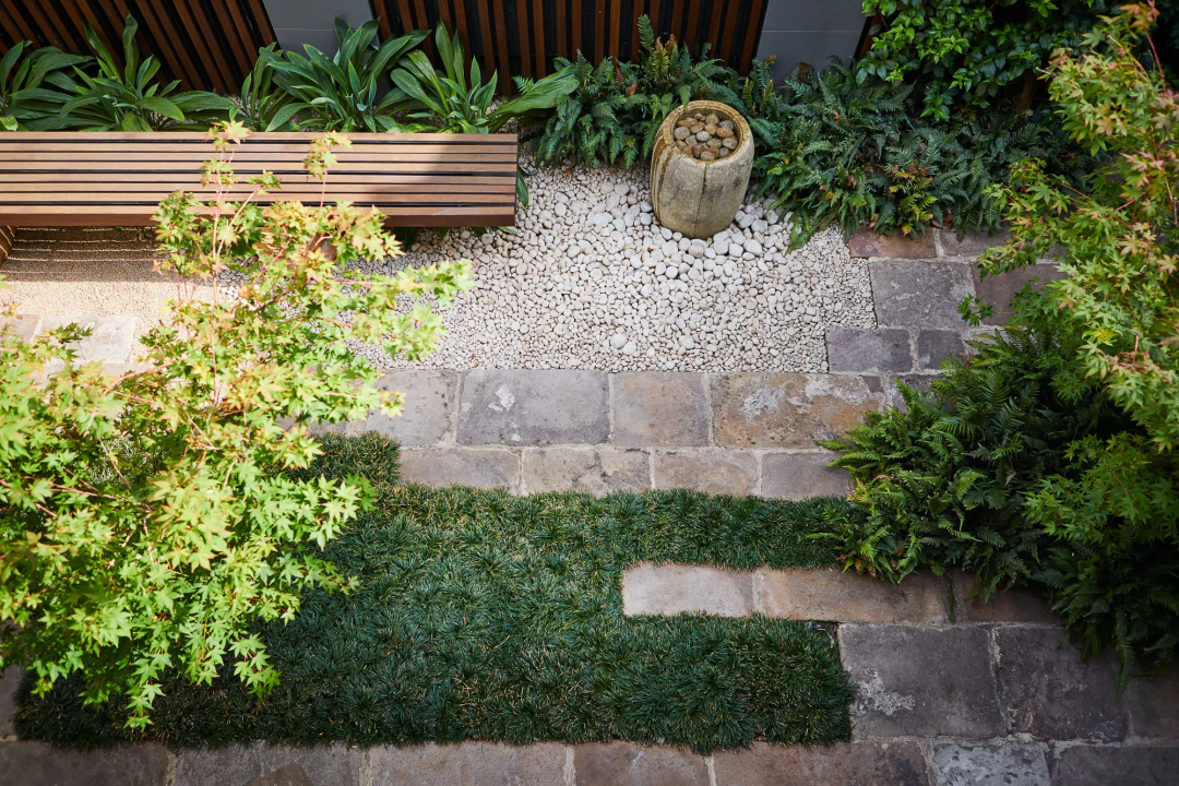 為了避免空洞,可以采用組合型鋪裝來搭配,例如石板+木平臺/小面積草坪,硬化面積建議不宜超過場地的70%,否則會帶來生硬冰冷的視覺。余下的空間作為綠化面積搭配,平衡視覺,同時種植一些低維護的綠植是最適合的。
