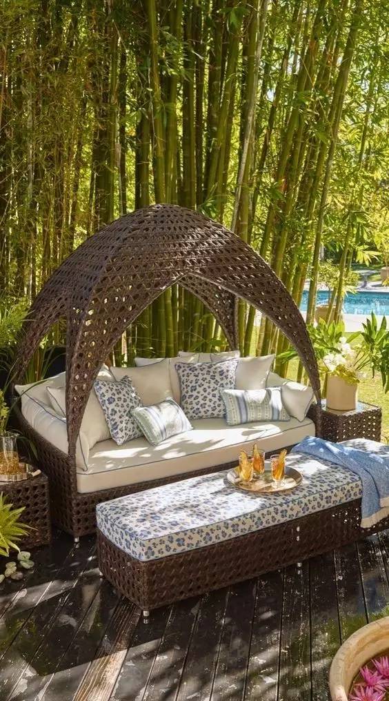 選擇什么樣的家具完全隨您心意,可能您的露臺(tái)并不需要太多的裝飾,但有一個(gè)坐臥兩用的沙發(fā)床絕對(duì)能滿足你所有的需求!一般來(lái)說(shuō),在沙發(fā)床的選擇上最好選擇帶有蔭蔽蓬的,自己另外安裝也不錯(cuò),這樣才會(huì)帶給您最好的午睡或閱讀體驗(yàn)。