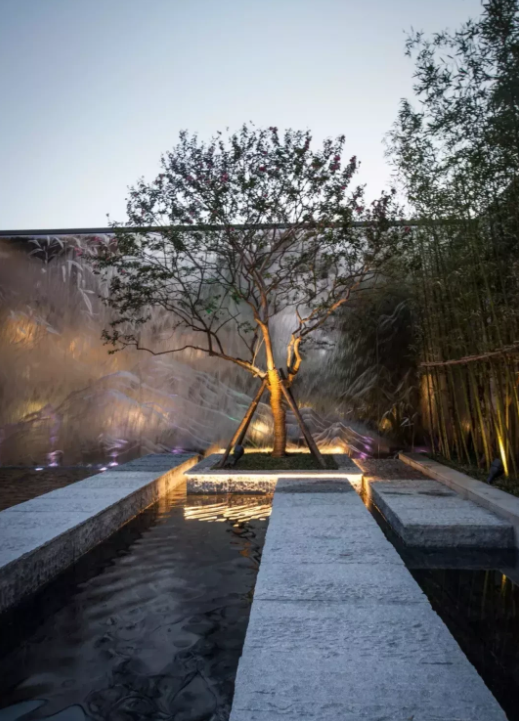 木原色是體現(xiàn)自然的色彩,與灰色、白色等搭配通常用鋪裝、臨水欄桿、小品構(gòu)架等,體現(xiàn)“新中式”景觀設(shè)計沿襲中國古典園林“雖由人作,宛若天開”的造園特點。青島別墅花園設(shè)計